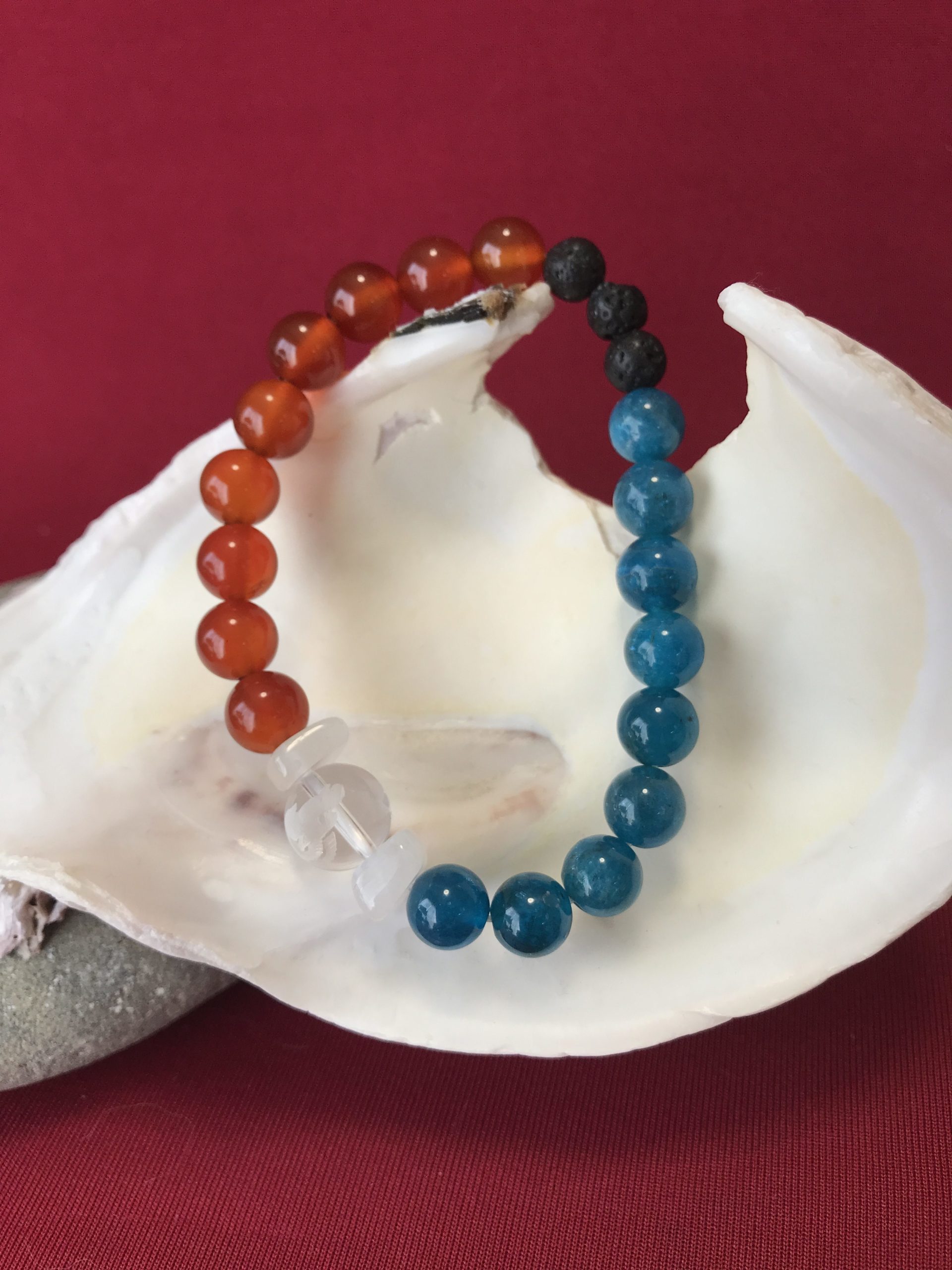 カーネリアンのブラッドオレンジ色とブルーアパタイトのディープブルー色のコントラストが鮮やかで、見てるだけで魔法にかかってしまいそうな、素晴らしいムーンブレスレットです。