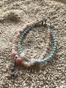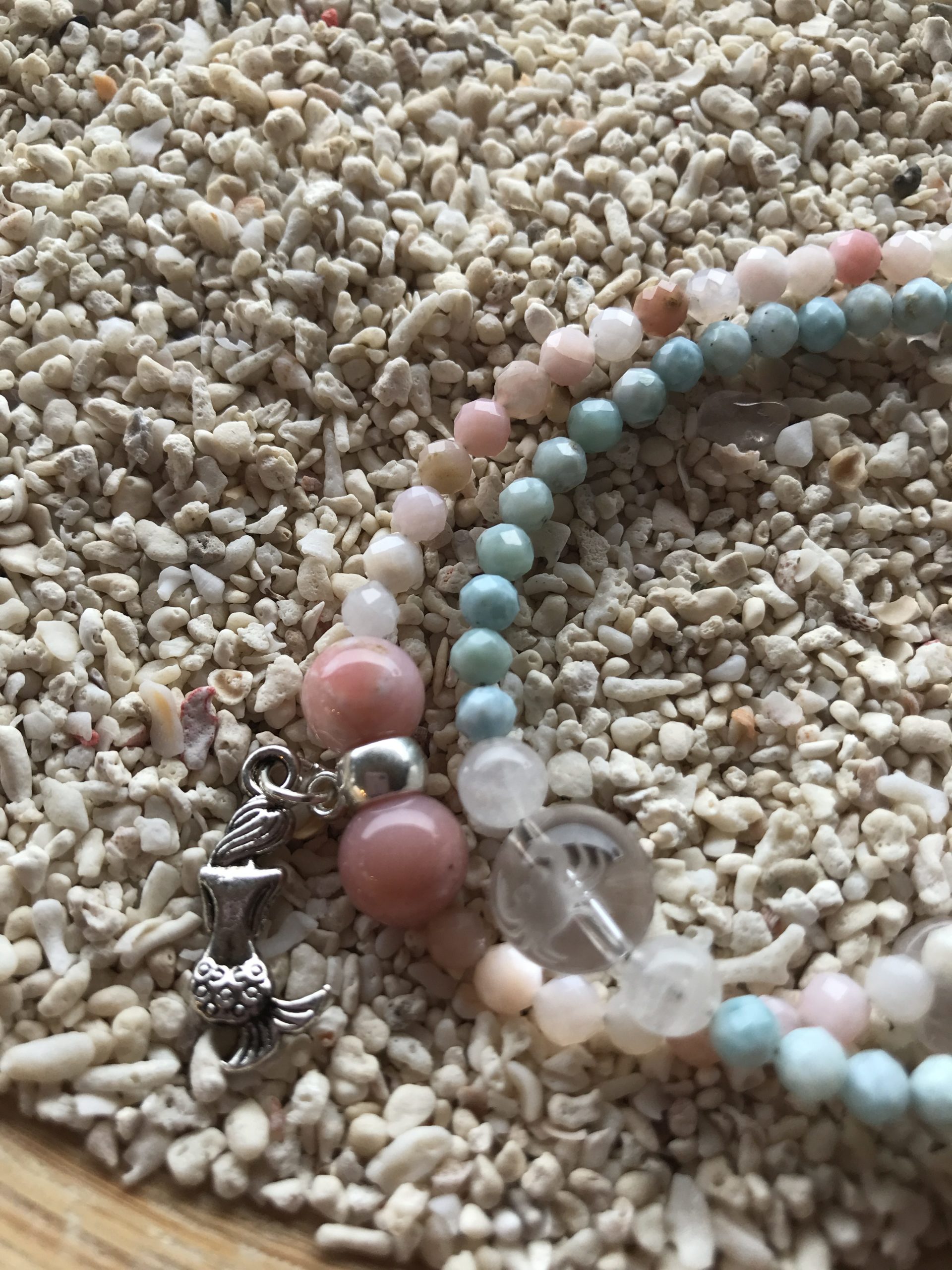 石は、ラリマーとピンクオパール。マーメイドの石といったら、この2つ。カラーもこのまま、ラリマーブルーとオパールピンク。勝手に色の名前つけましたが、ラリマーブルーは、ちょっとアイスブルーみたいな色ですよね。実際は、水色に白が水に溶け込むような模様を描き出しているのがラリマーという石。高価です。なので、これより大きな石でブレスレットを作ると高額になってしまうので、このサイズで。しかも、私はこのサイズ好きです。ラリマーは、海のエネルギーとつながります。地球の7割が海。そして人間の体は7割が水分。私たちは小さい地球なんです。地球の海と私たちの水分をつなげるのがラリマーです。