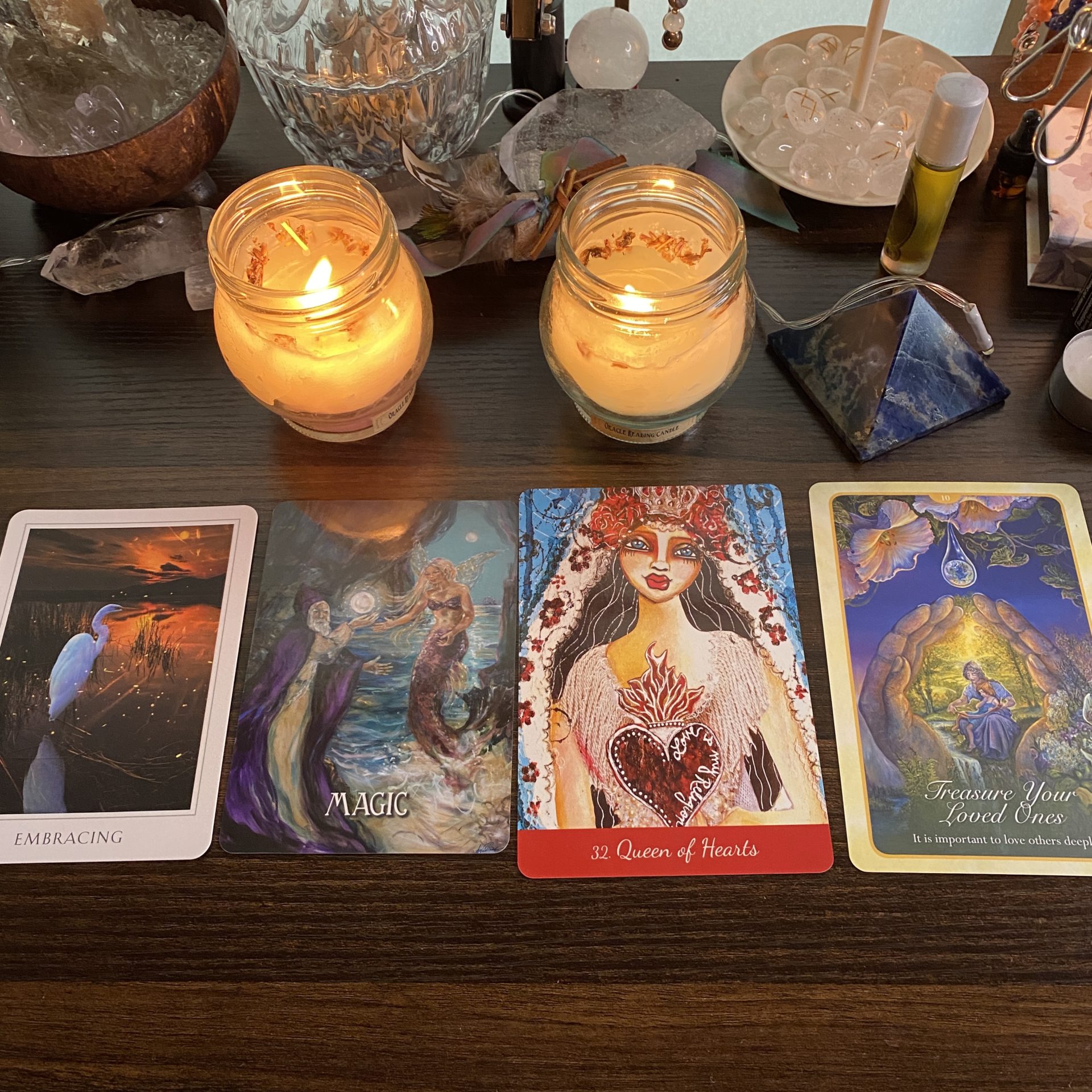 ブレッシングのカードは、地球からの祝福がありますよとのこと。マジックのカードは、オーシャンマジック始められますよ、梅雨が明けるからはじめられるよとのこと。クイーンオブハートは、ハートに火が灯る、ライオンハートのこと。最後のカードは、すでに私達は素晴らしい宝物をその手に持っているのよ、そこに地球からの恩恵があるよ、素晴らしい宝物って家族のこと、家族を大切にしようねっていうメッセージです。